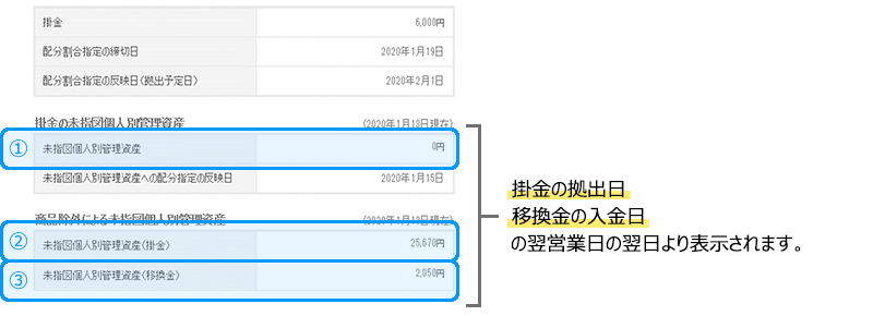 掛金の配分割合に除外による未指定の割合が発生している状態で拠出された掛金のうち、未指定割合に相当する掛金は、拠出後商品の購入に充てられず、「商品除外による未指図個人別管理資産(掛金)」として現金(待機資金)の状態で管理されます。